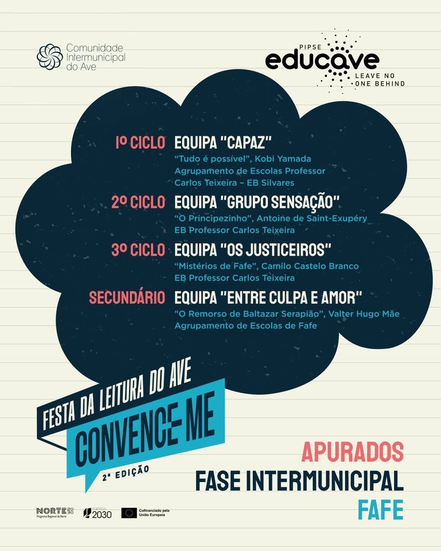 Foram apuradas para a fase intermunicipal, a realizar a 28 de abril, em Vizela, a equipa ‘Capaz’, da EB Silvares, com a obra “Tudo é Possível”, de Kobi Yamada (1º ciclo); a equipa ‘Grupo Sensação‘, da EB Professor Carlos Teixeira, com a obra “O Principezinho”, de Antoine de Saint-Exupéry (2º ciclo); a equipa ‘Os Justiceiros’, também da EB Professor Carlos Teixeira, com a obra “Mistérios de Fafe”, de Camilo Castelo Branco (3º ciclo); e a equipa ‘Entre Culpa e Amor’, do Agrupamento Escolas de Fafe, com a obra “O Remorso de Baltazar Serapião”, de Valter Hugo Mãe (Ensino Secundário).