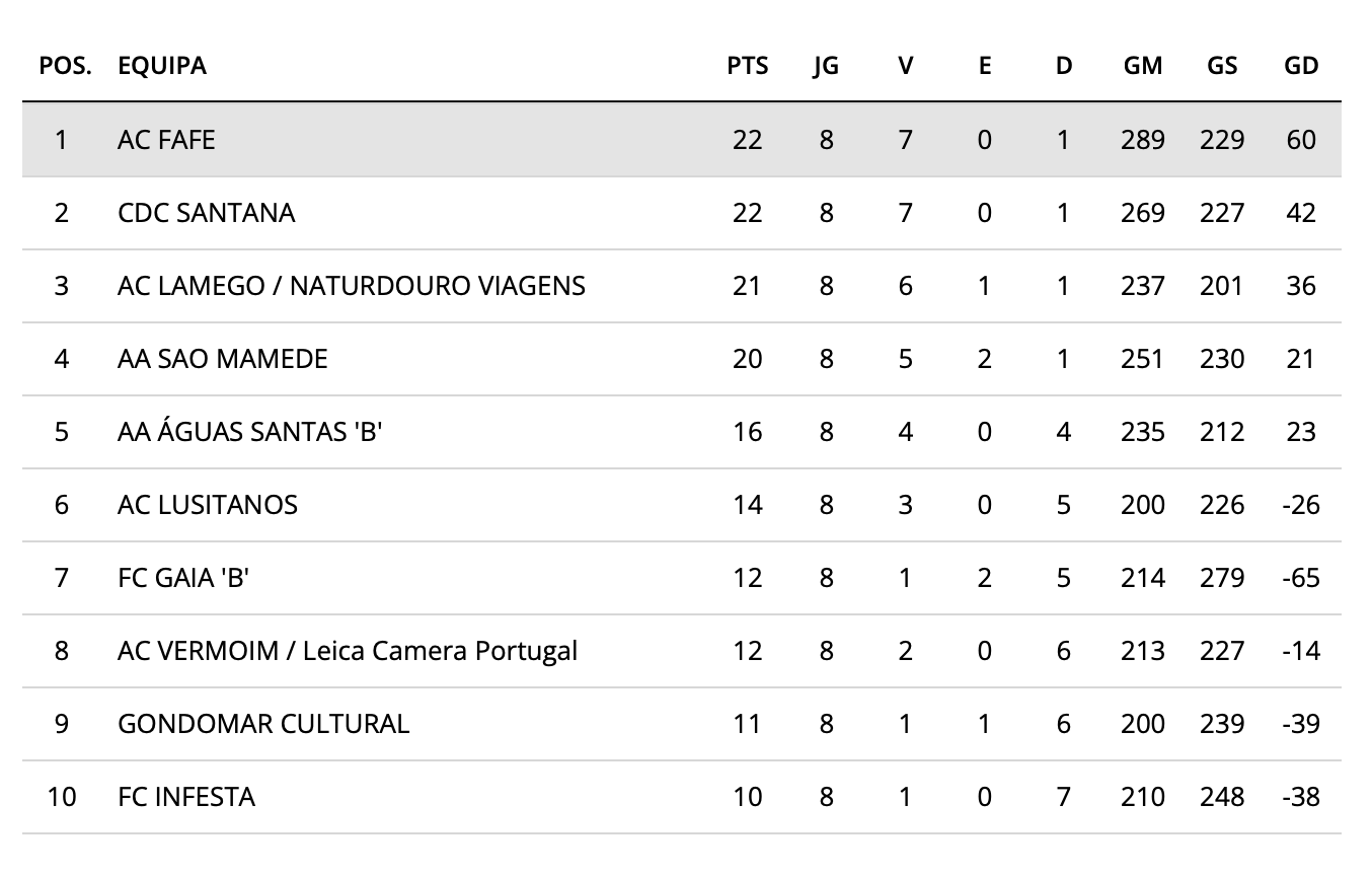 Com este resultado, o ACF está na 1ª posição da tabela classificativa, em igualdade pontual com o CDC Santana, com 22 pontos.