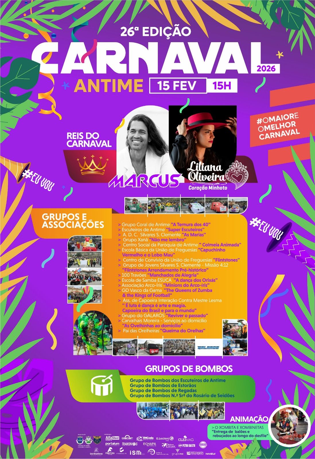 Foi divulgado, esta terça-feira, o cartaz completo do Carnaval de Antime, que promete sair à rua na tarde do próximo domingo, 15 de fevereiro. O desfile vai juntar vários grupos e associações e terá os cantores Marcus e Liliana Oliveira como ‘reis’ do Carnaval.