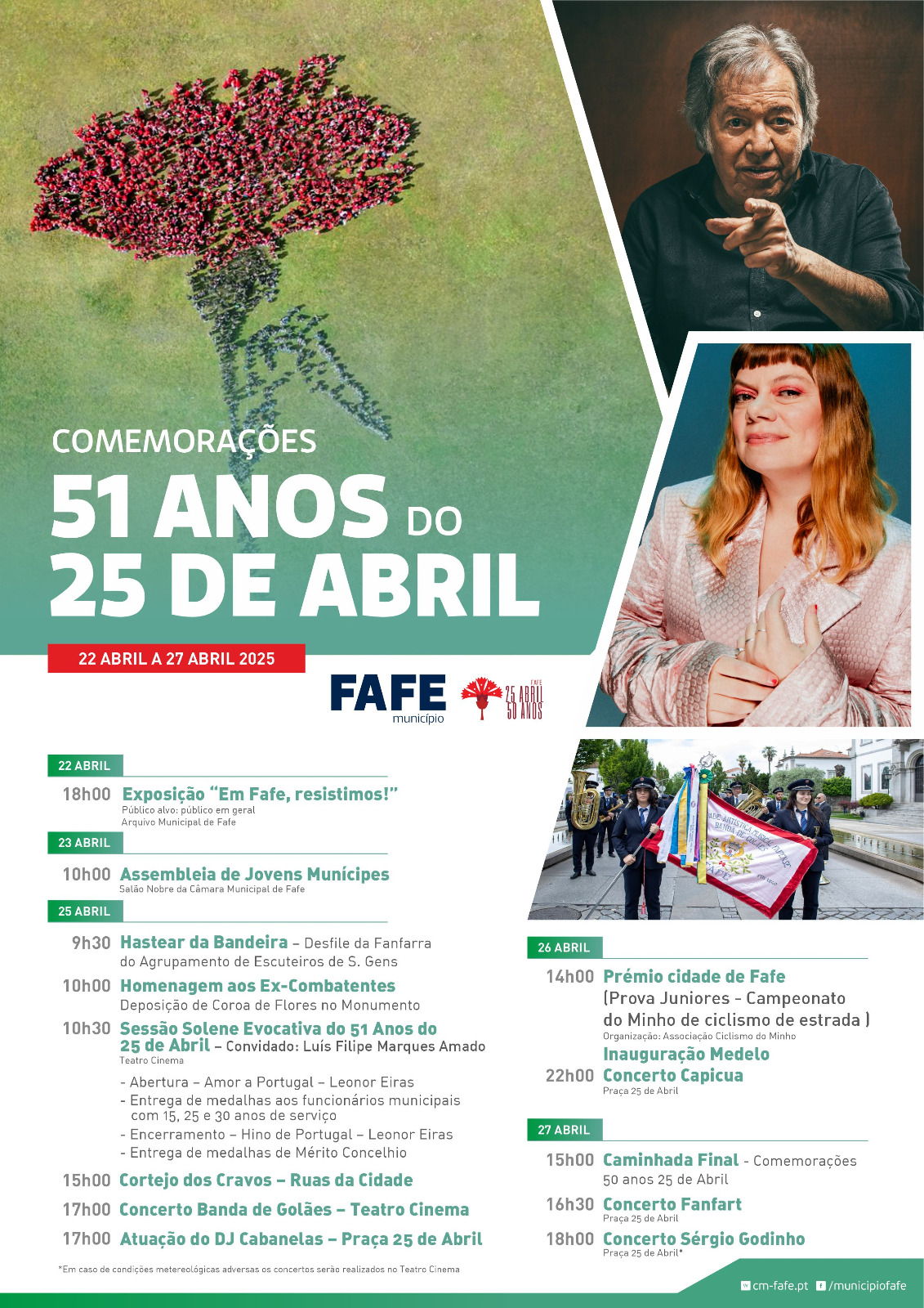 O 25 de Abril ficará ainda marcado por um concerto da Banda de Golães, pelas 17h00, no Teatro Cinema de Fafe.