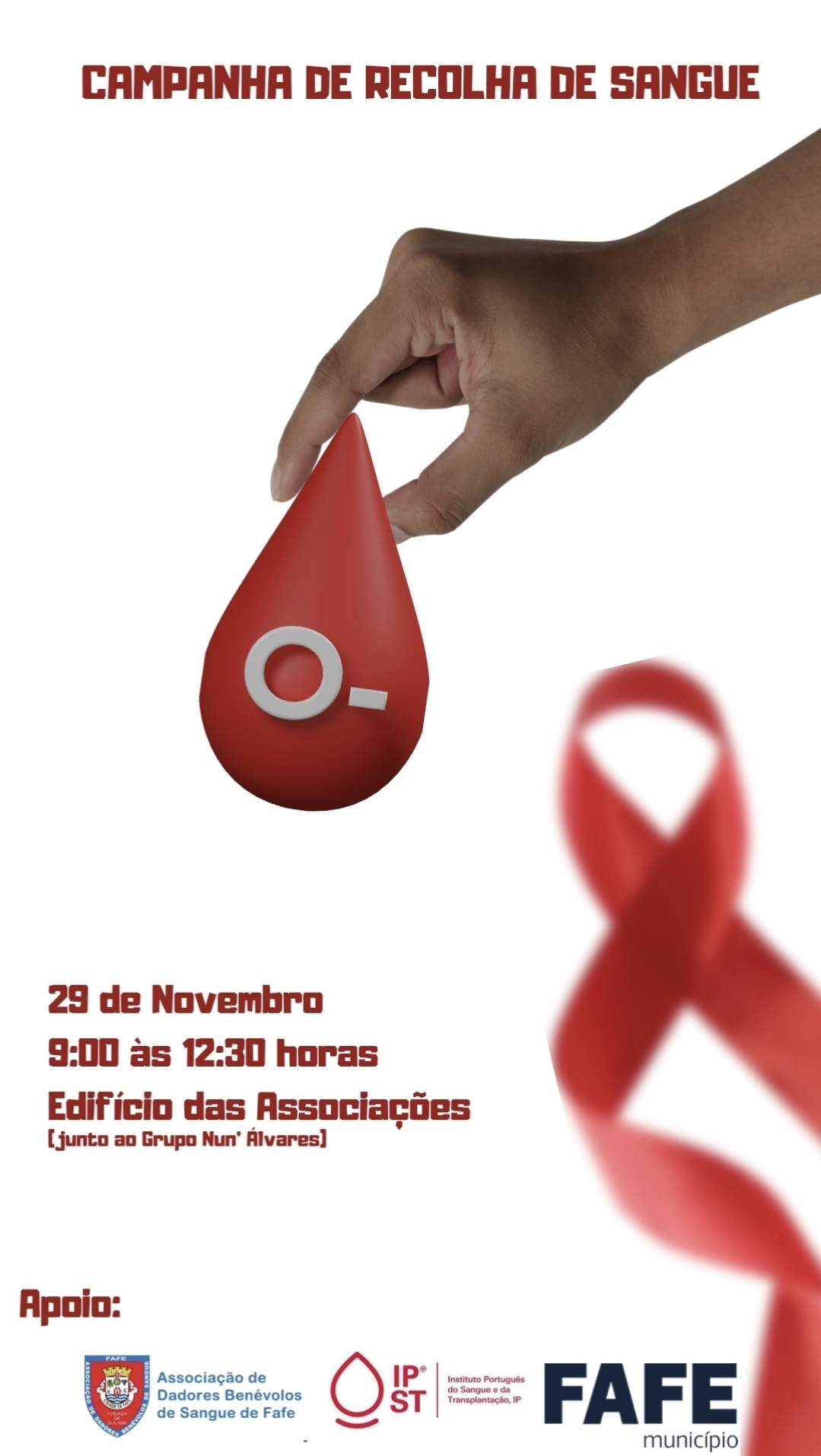 A Associação de Dadores Benévolos de Sangue de Fafe promove, este sábado, 29 de novembro, uma campanha de recolha de sangue e registo de medula óssea, no Edifício das Associações, junto à sede do Nun’Álvares.