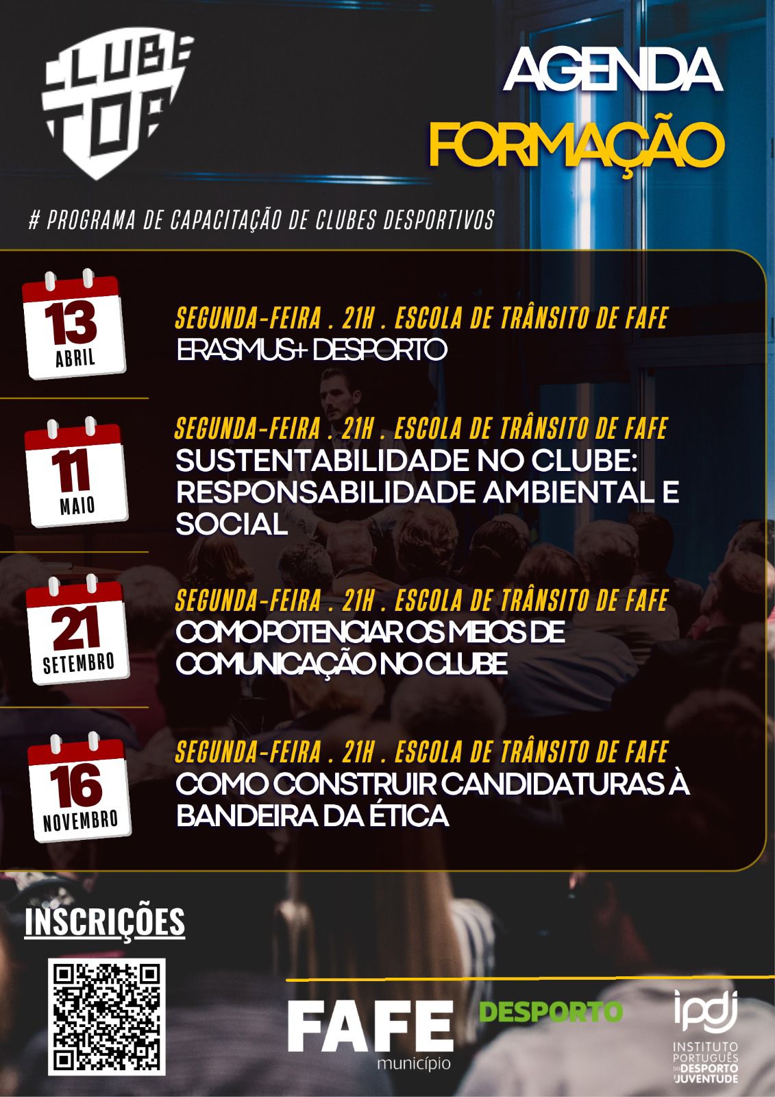 As ações de formação decorrerão no Auditório da Escola de Trânsito de Fafe, abordando temas estratégicos nas áreas da gestão, comunicação e ética no desporto e a primeira inicia hoje.