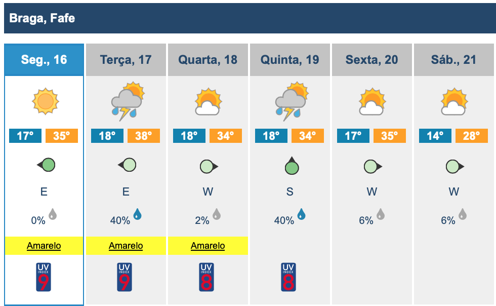 As previsões apontam que Fafe venha a atingir os 38ºC de máxima esta terça-feira, com possibilidade de ocorrência de trovoadas.