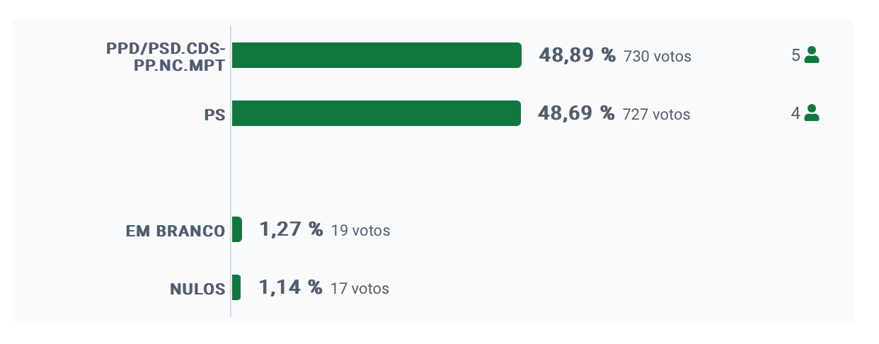 A coligação alcançou 48,89% da votação, correspondente a 730 votos. Já a candidatura do PS, encabeçada pela atual presidente, Manuela Jordão, terminou a contabilização com menos três votos que o agora eleito (727).