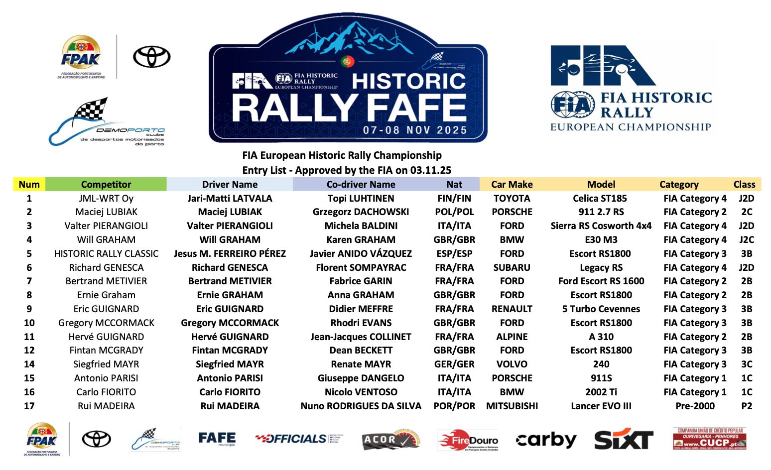 “Embora posicionada no calendário como prova (10ª) de encerramento do CERH, o Historic Rally Fafe beneficia da circunstância de haver ainda muito a decidir ao fim de 9 jornadas para atrair uma boa parte dos principais protagonistas. E é assim que reunirá 16 equipas, uma das quais portuguesa, com destaque para os cinco primeiros da classificação absoluta do CERH: Maciej Lubiak (Porsche 911 Carrera RS 3.0), Will Graham (BMW M3), Jari-Matti Latvala (Toyota Celica Turbo 4WD), Ernie Graham (Ford Escort RS 1800) e Jesus Ferreiro Perez (Ford Escort RS 1800)”, avança a Demoporto, organizadora da prova, em comunicado.