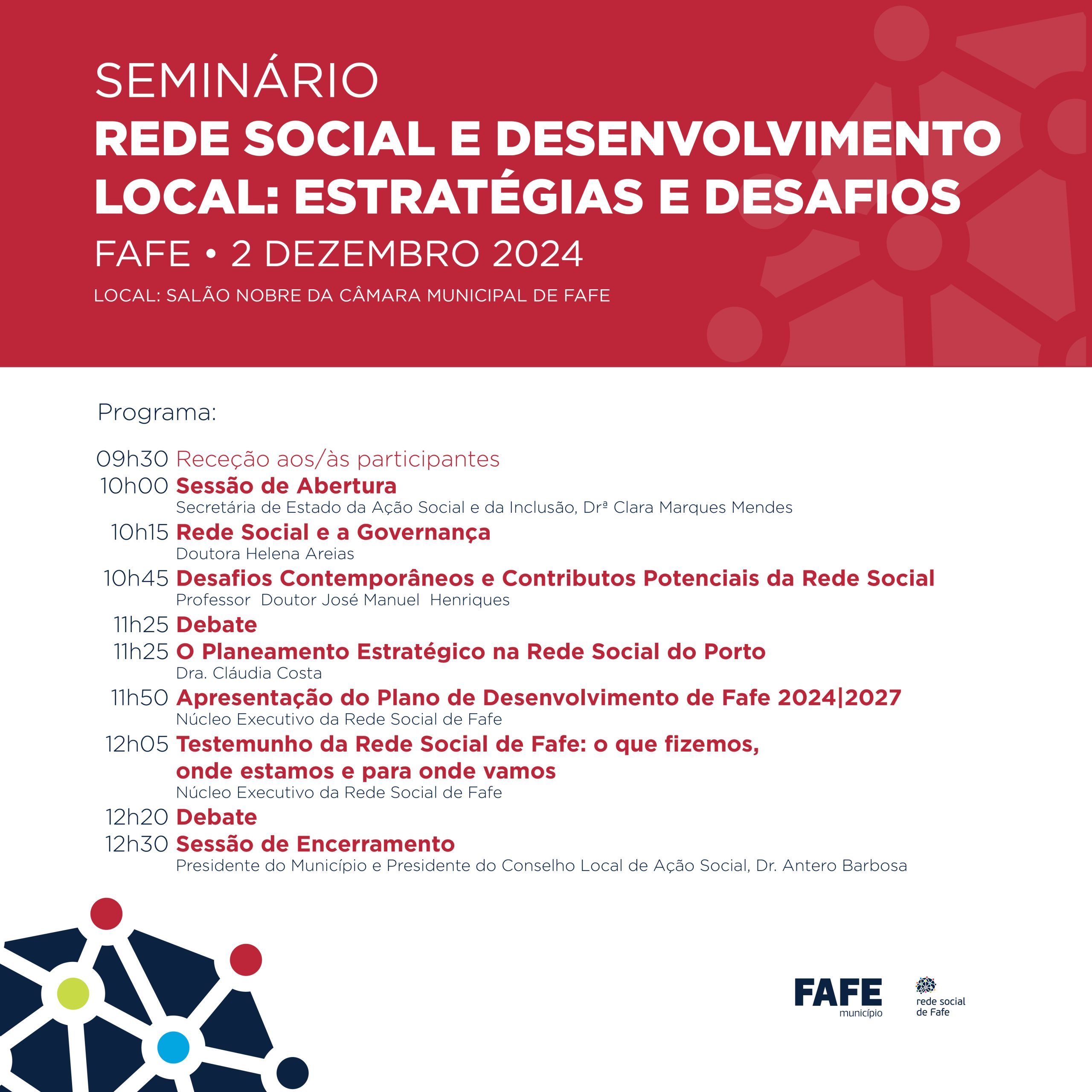 Segundo o município, o seminário contará com a participação de convidados como Helena Areias (Rede Social e a Governança), o professor José Manuel Henriques (Desafios Contemporâneos e Contributos Potenciais da Rede Social), Cláudia Costa (O Planeamento Estratégico na Rede Social do Porto) e o testemunho da Rede Social de Fafe (o que fizemos, onde estamos e para onde vamos?).