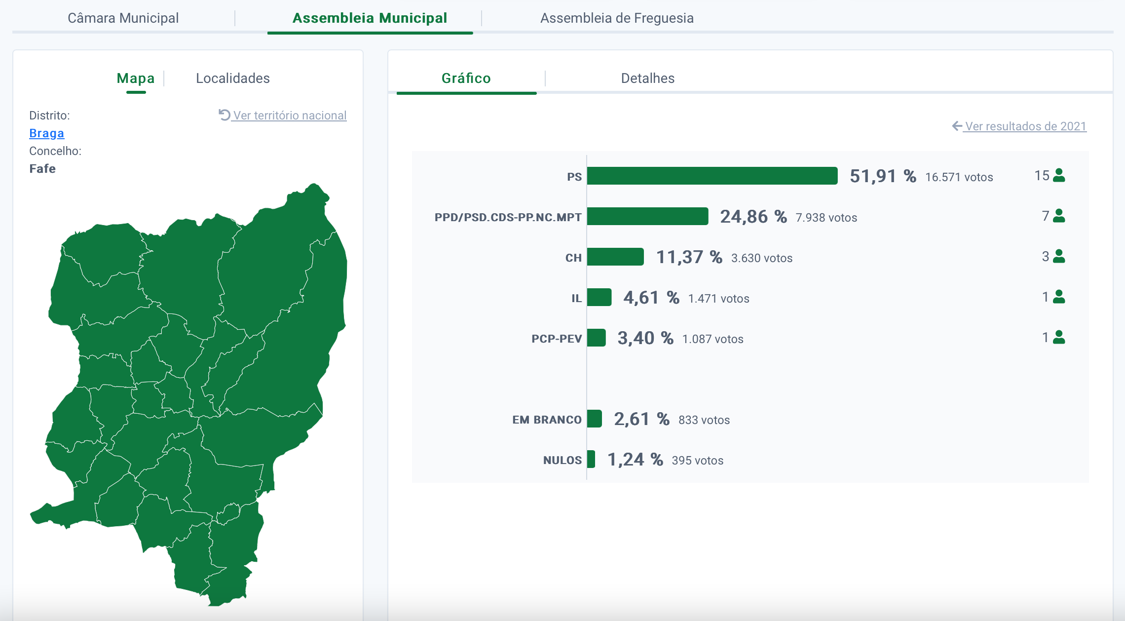 O Partido Socialista venceu a eleição para a Assembleia Municipal de Fafe, com 51,91% dos votos. A lista liderada por Raul Cunha elege assim quinze representantes para este órgão autárquico, reforçando a sua posição face a 2021, em que elegeu 11.