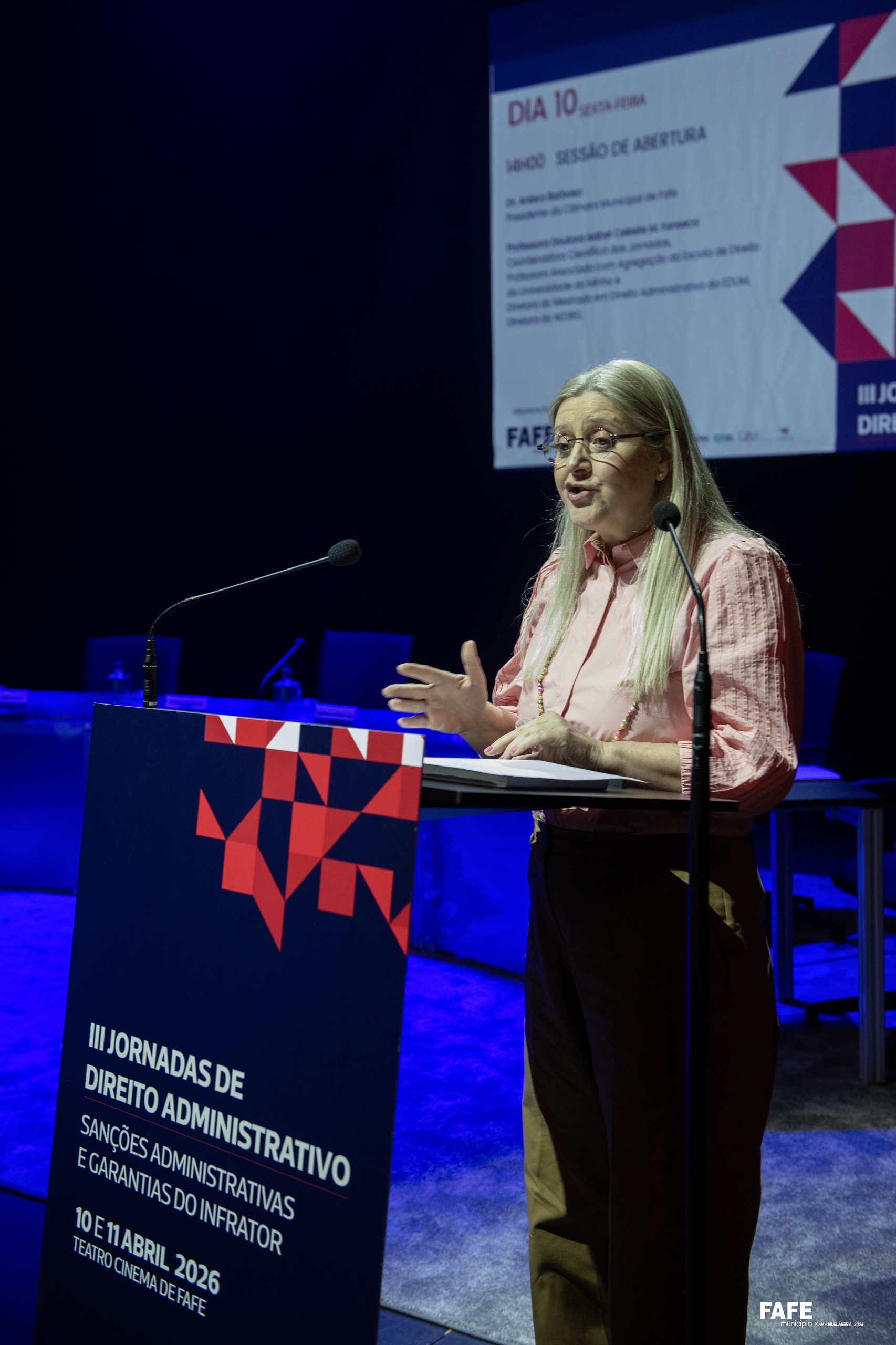 Isabel Celeste Fonseca, coordenadora científica das Jornadas de Direito Administrativo, tomou da palavra, introduzindo o tema das Jornadas — «Sanções Administrativas e Garantias do Infrator» — e descrevendo a composição dos quatro painéis do evento, bem como os respetivos moderadores e oradores. Terminou a sua alocução reiterando o desejo de que estes “sejam dois dias inquietantes e desafiadores, onde serão debatidas questões fulcrais no Direito Administrativo”, agradecendo ao Município de Fafe e a todos os parceiros pela organização do evento.